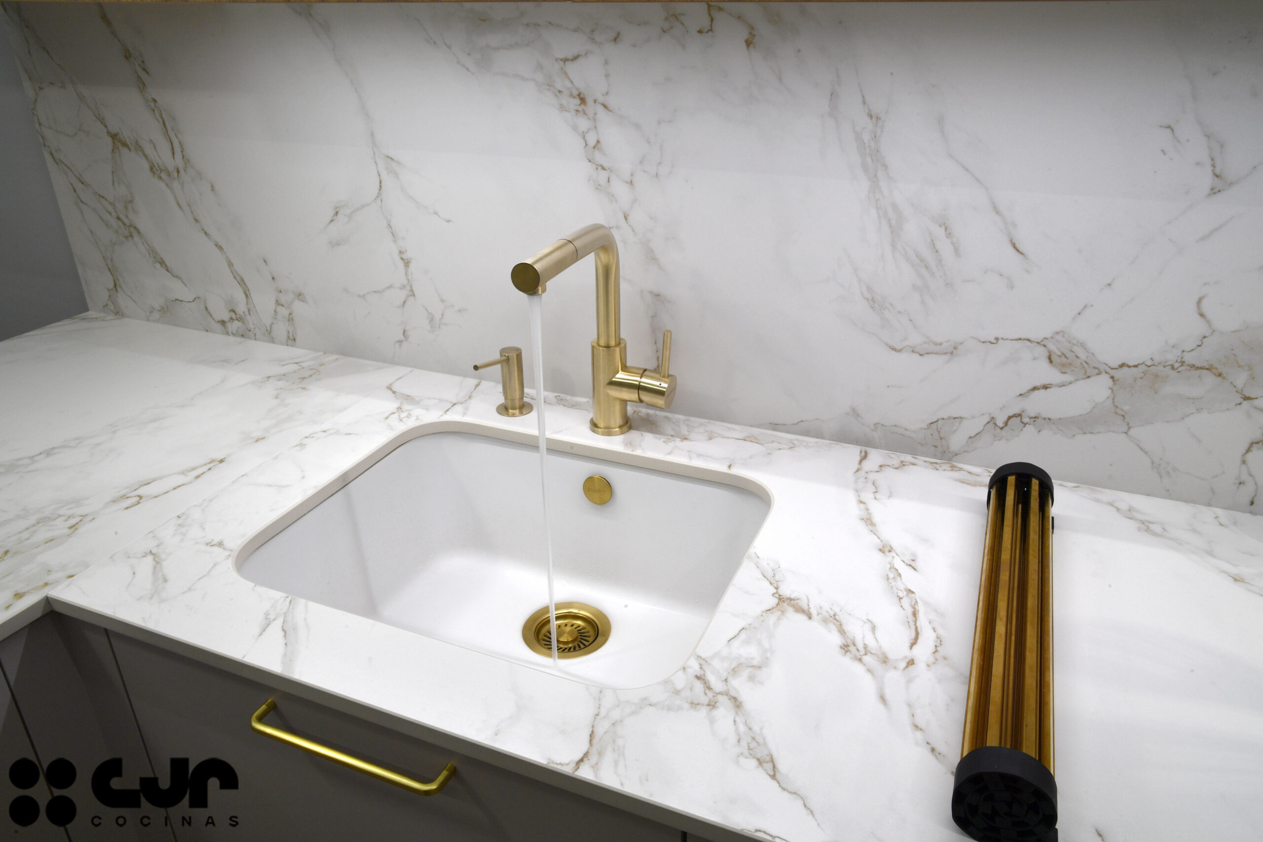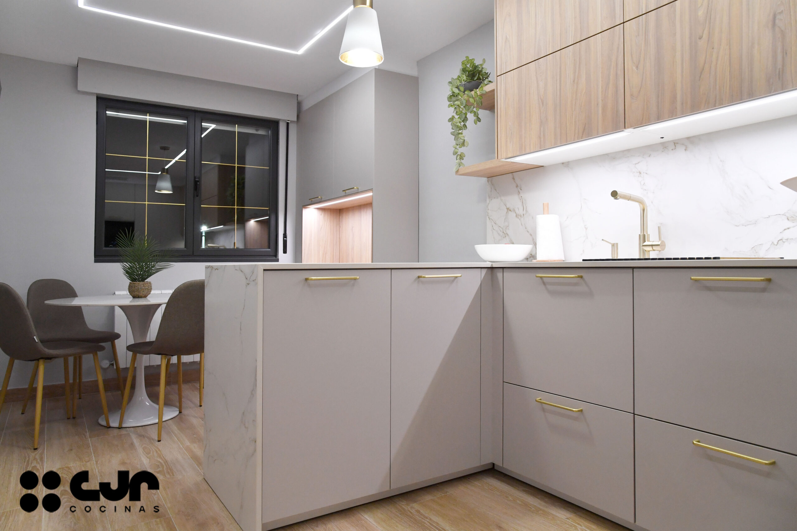 Esta cocina cashmere y madera en L con península combina a la perfección el tono cashmere con madera, creando un ambiente cálido y sofisticado. Pero eso no es todo, porque también hemos añadido detalles en dorado como los tiradores y el grifo, logrando un toque de elegancia que hace que cualquier cocina brille con luz propia.