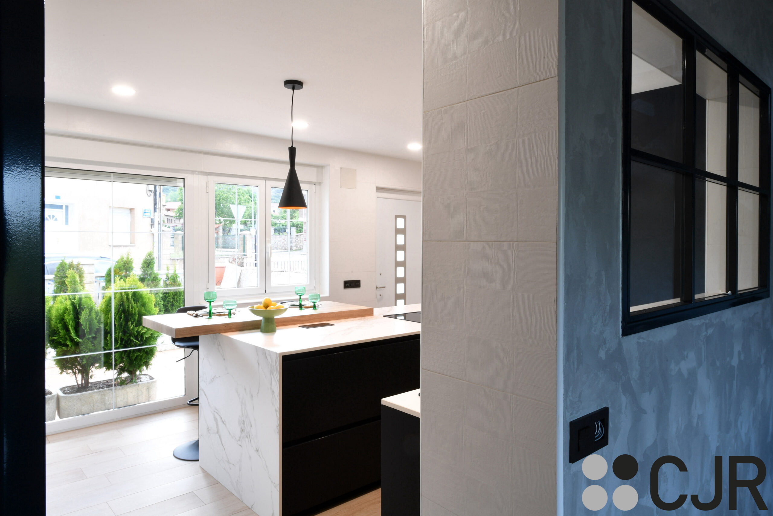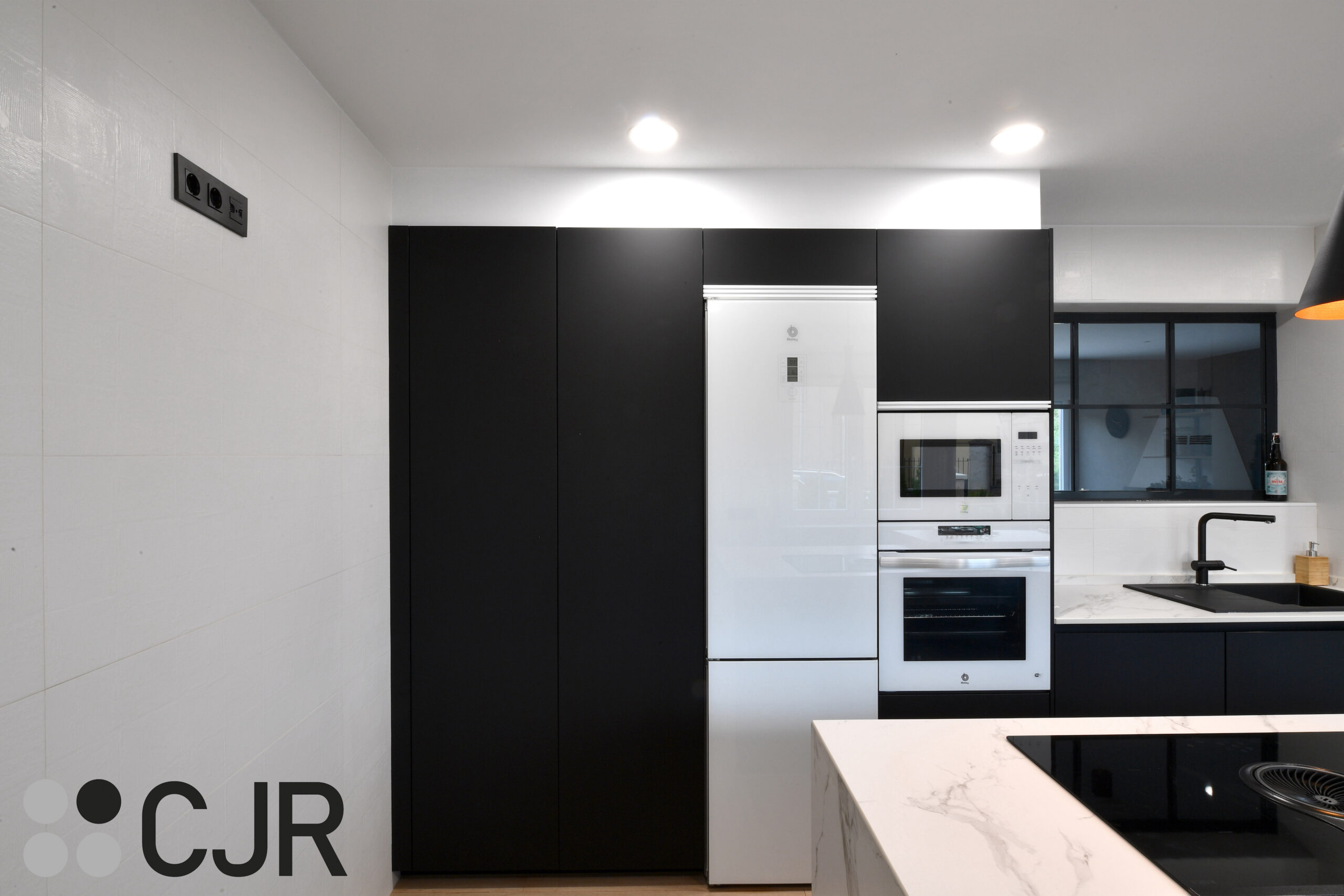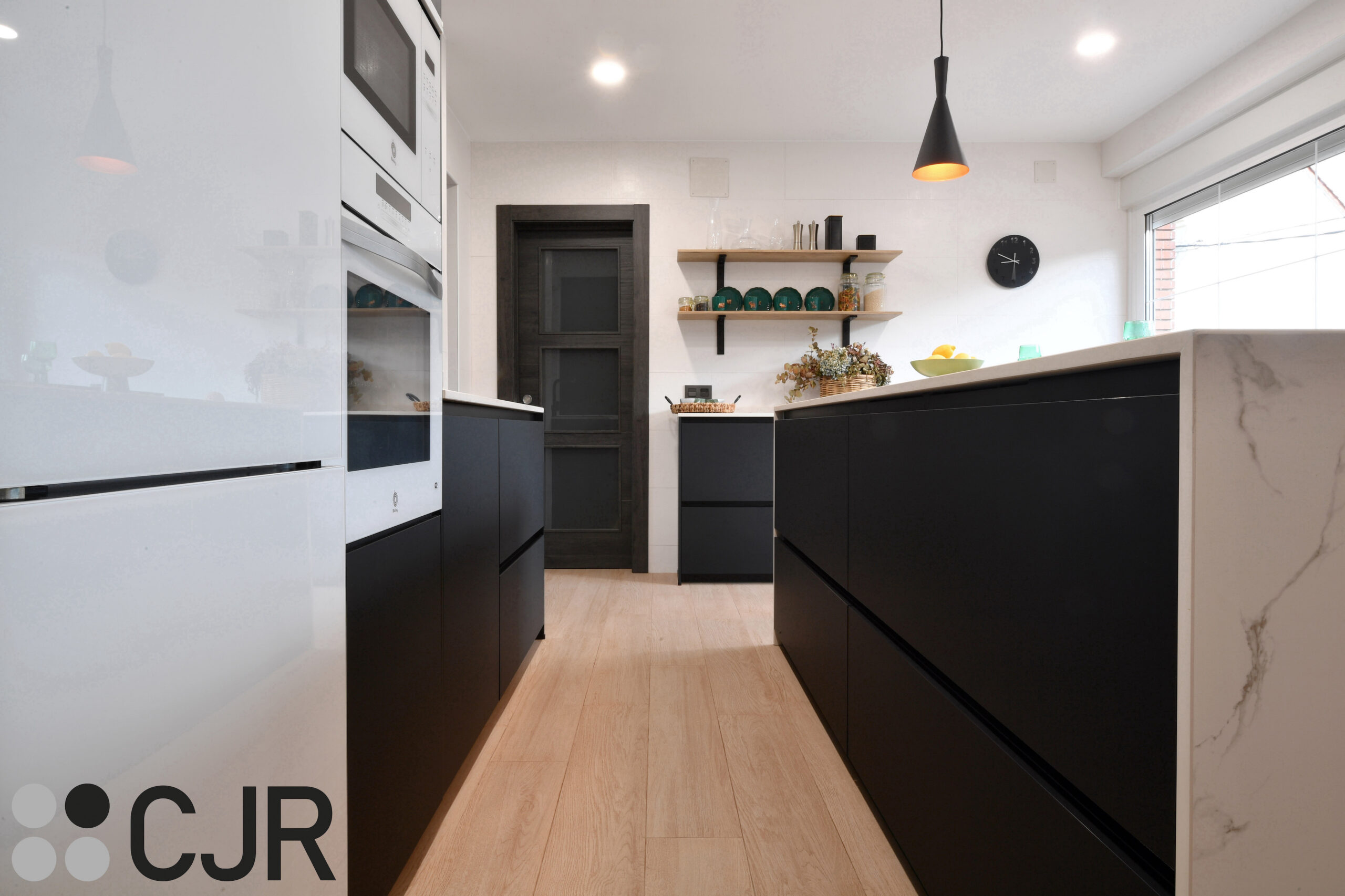 Cocina moderna negra mate con isla y barra madera CJR