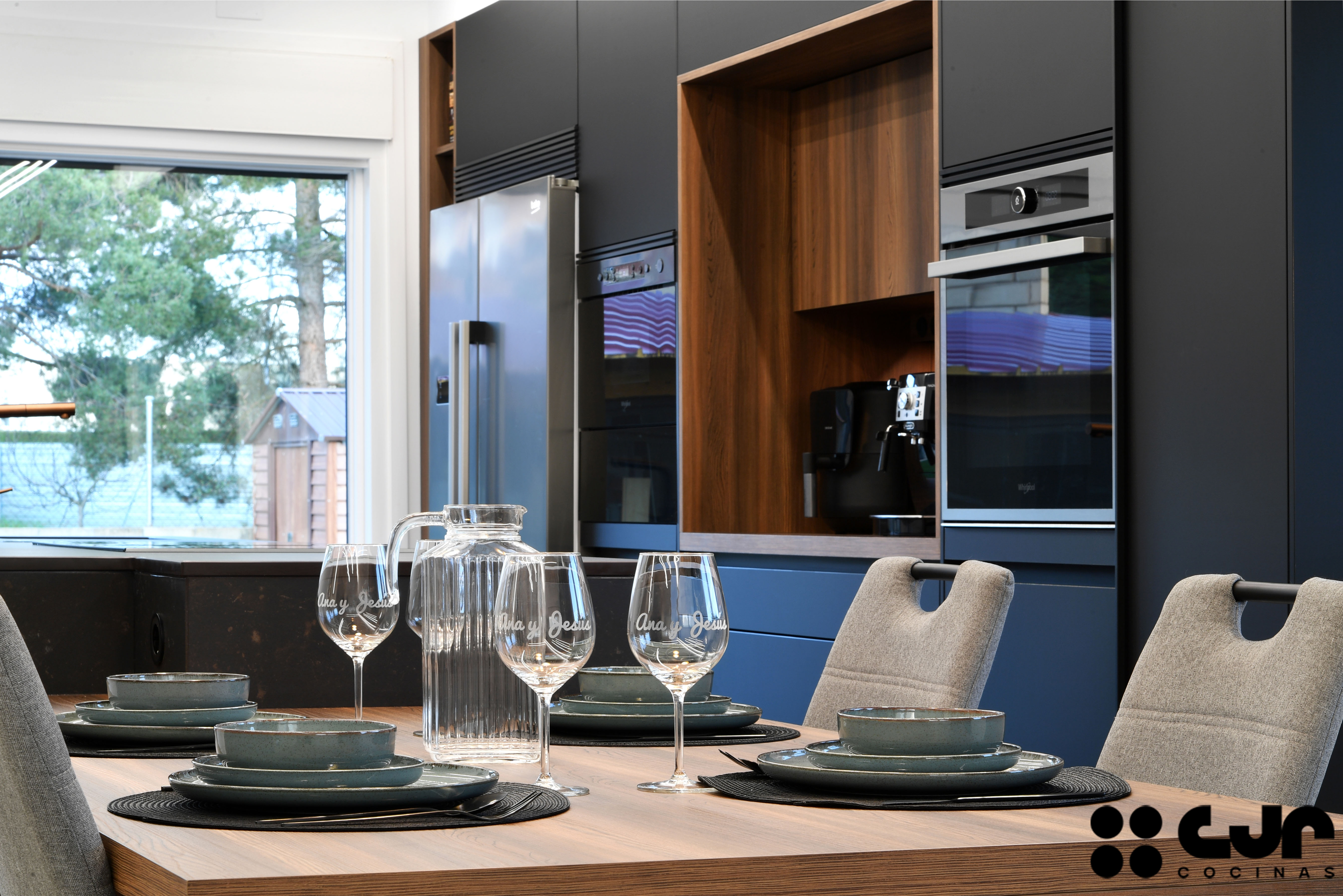 El acabado principal de esta cocina es una espectacular combinación de negro mate con madera natural, una mezcla que aporta elegancia, calidez y modernidad a partes iguales. La encimera de Dekton Kelya completa el conjunto aportando un toque sofisticado.
