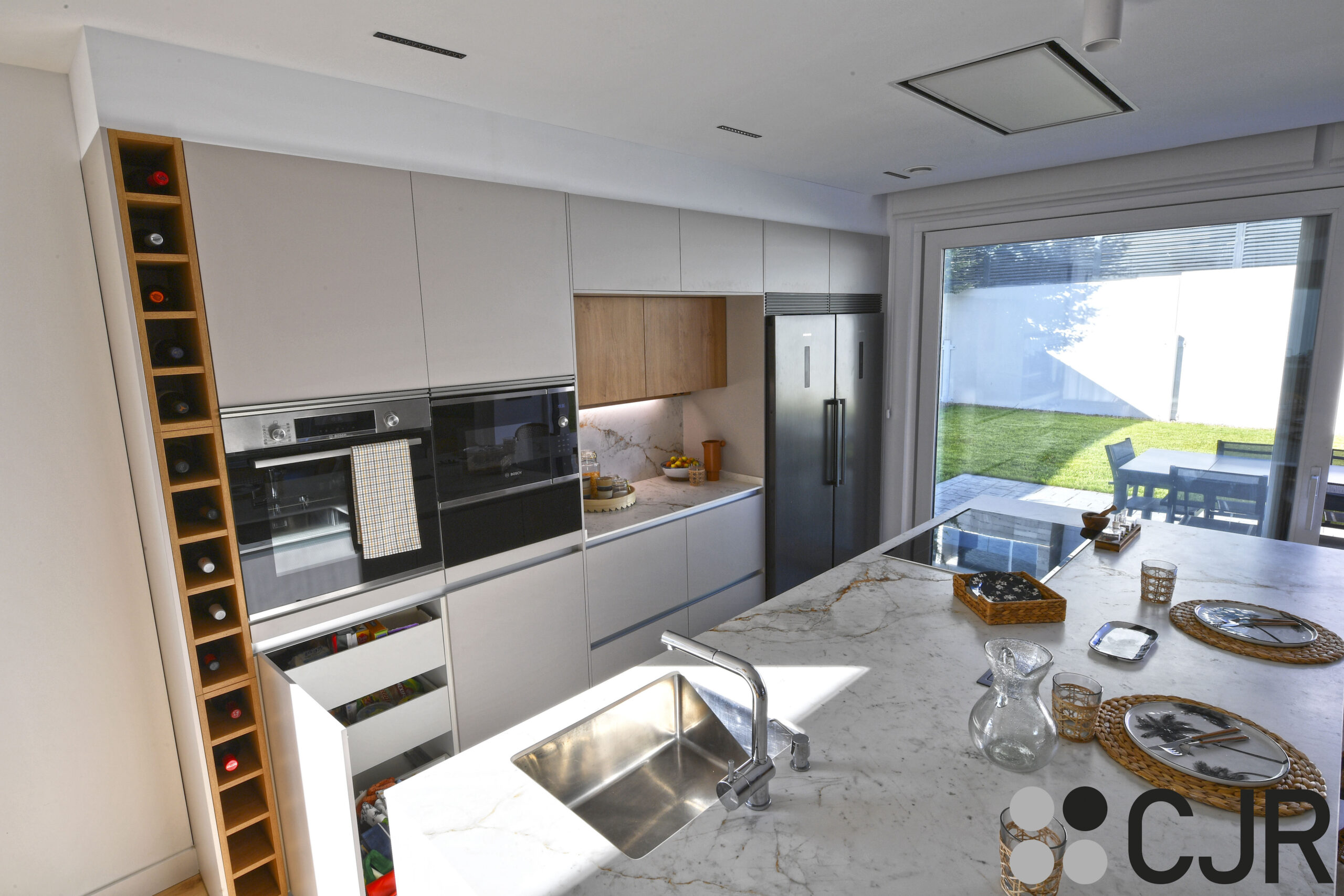 Y es que en esta diseño de cocina blanca y madera hemos incluido en el diseño diferentes soluciones como un botellero o el cajón CJR.