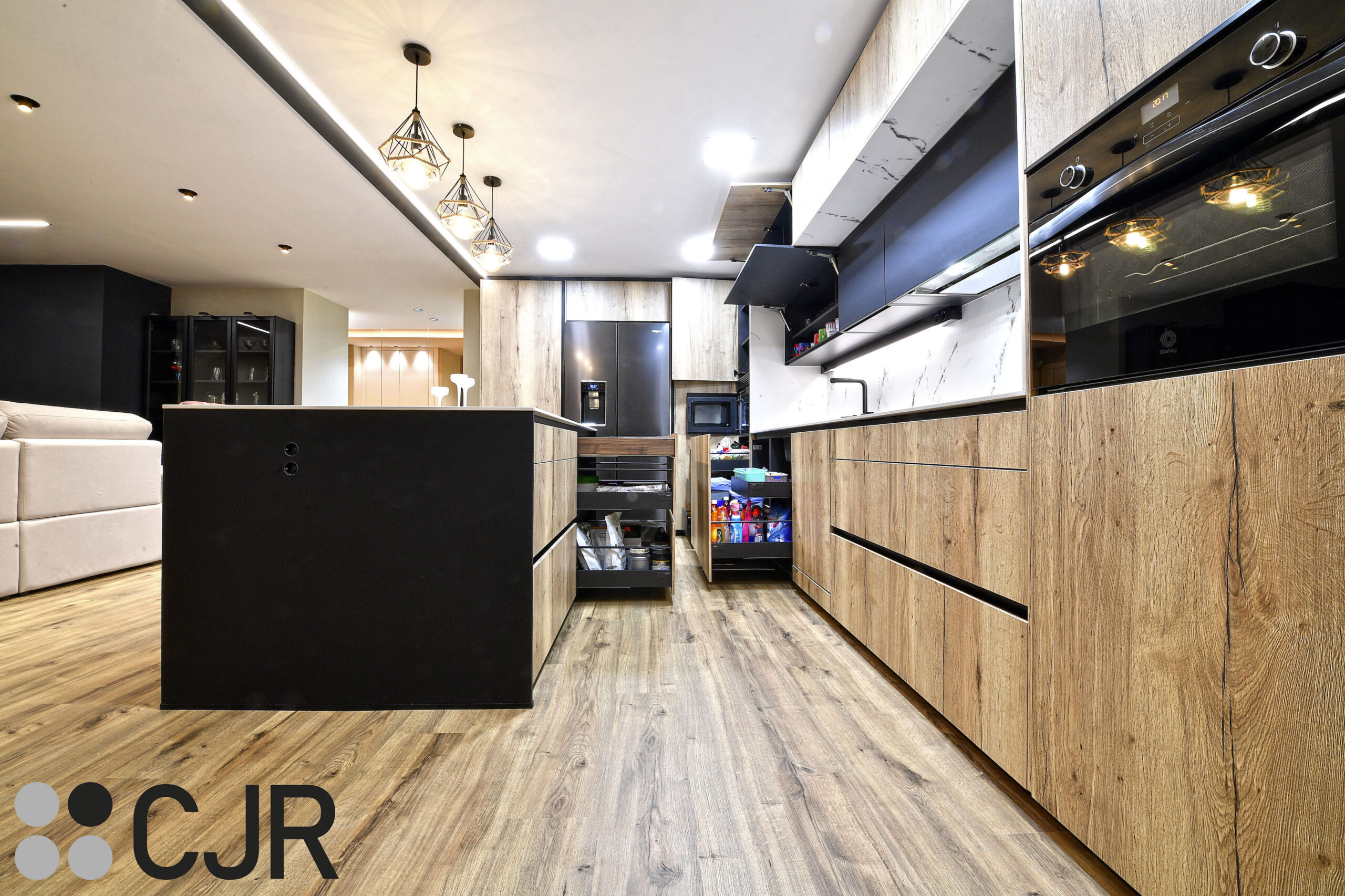 Cocinas madera y negras mate con isla Dekton Kairos CJR