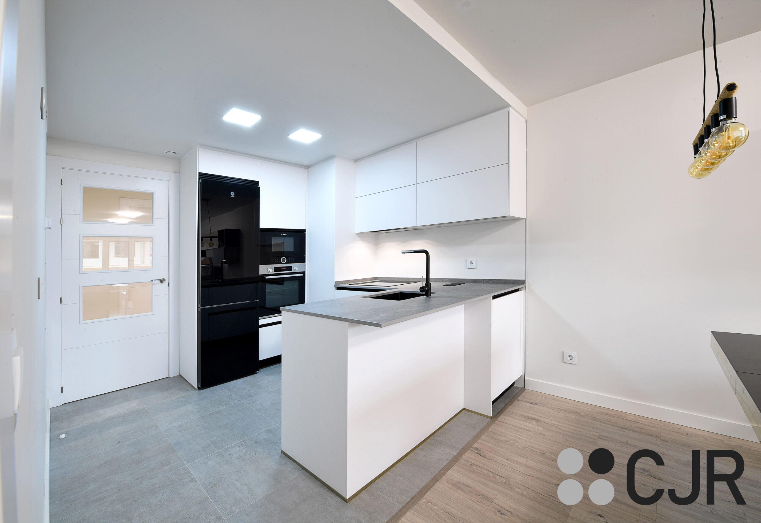 Este proyecto se centra especialmente en el diseño de cocinas pequeñas y modernas con barra CJR, y en este caso tuvimos que hacer el diseño de un espacio de ¡menos de 9 metros cuadrados! Sin duda estamos hablando de una cocina pequeña pero eso no impidió incluir 7 electrodomésticos: frigorífico, lavadora, lavavajillas, horno, microondas, placa y campana.